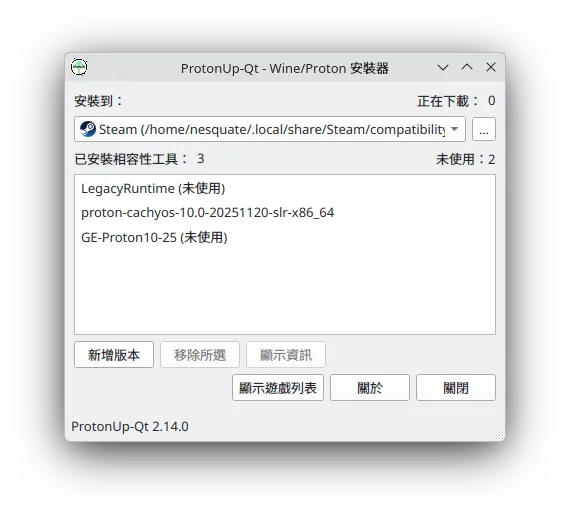後來看到 Ivon 寫的 ProtonUp-QT 和 Protontricks 文章,才發現有這工具能用,於是快快下載來看。(下載的版本是 AppImage 版,因為 Steam 不是用 Flatpak 裝,如果裝 Flatpak 版不確定能不能互通)